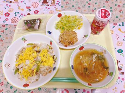 五目ちらし寿司、サケの手毬揚げ、コールスロー、ABCスープ、桜餅、イチゴジョア