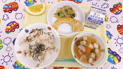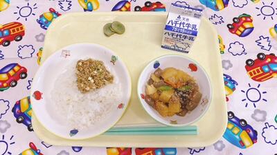 昆布ごはん、たらのピリ辛みそ焼き、鶏肉とじゃがいもの揚げ煮、牛乳