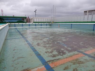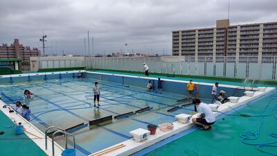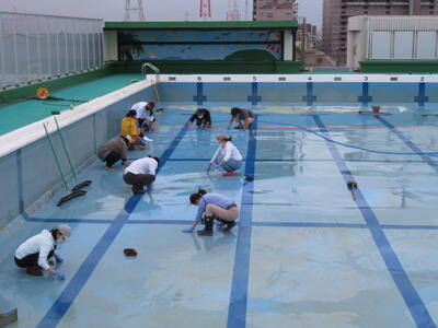 6月14日 約20名の保護者の方にボランティアでご協力いただき、半日かけてプール掃除を行いました。はじめは泥がたまっていたり、黄土色がかっていたりした床や側面をみなさんでブラシやスポンジでこすり、とってもきれいになりました。ありがとうございました。