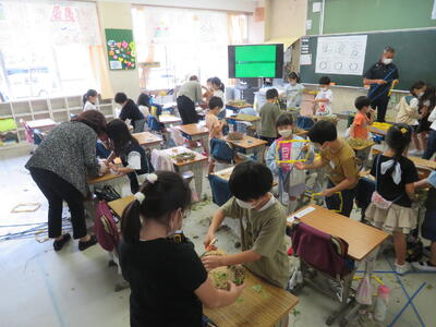 9月29日 1年生は生活科で育ててきたアサガオのつるを使ってリースを作りました。