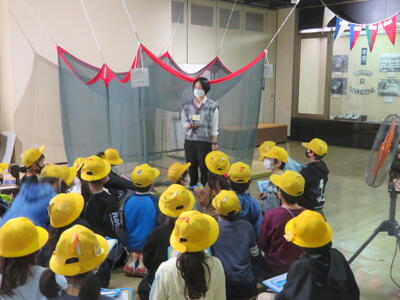歴史博物館では、昔の道具展の見学をし、二槽式や手動式の洗濯機に触れたり、蚊帳の中に実際に入ってみたりし、昔の人の生活を体験することができました。