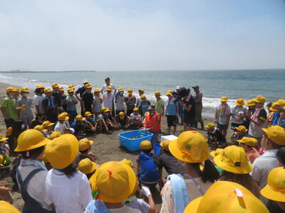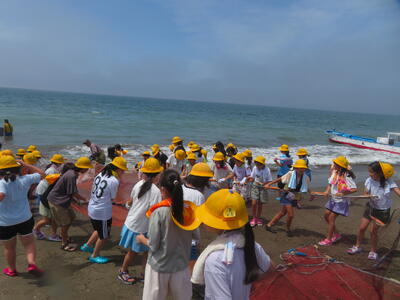 富津海岸では、地元の漁師さんの指導の下、地引網体験をしました。