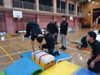 研修では、先生たちがマット運動や跳び箱運動に取り組み、技のポイントや子どもたちへの指導方法を特別講師の先生から教わりました。