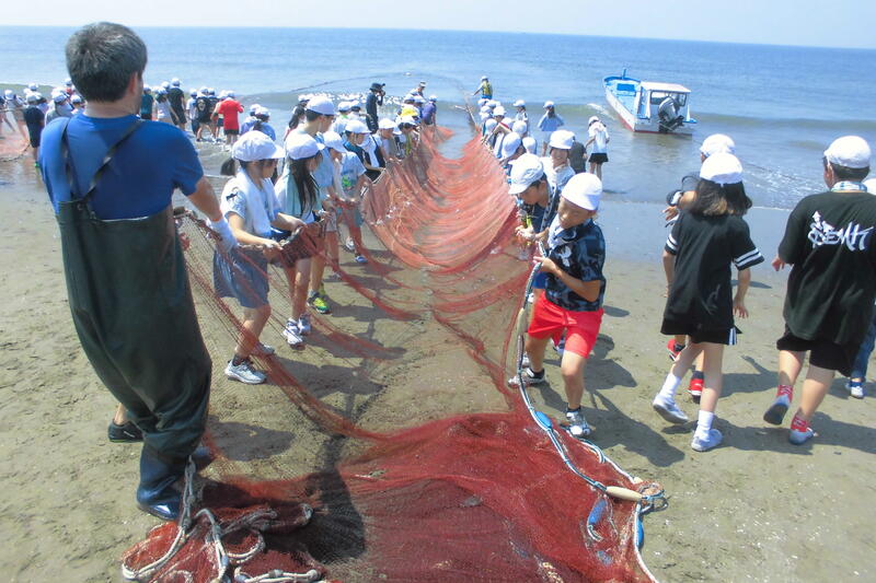 富津海岸では、地元の漁師さんと地引網体験をしました。みんなで力いっぱい網を引き揚げると、網の中に「マダイ」や「アジ」など、たくさんの魚がとれて、みんな大興奮でした。