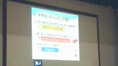 自分の体は、自分の食べたものからできている。中学生の時に食べた食事の内容が、おじいちゃんおばあちゃんになってからも影響すること。5つの栄養素をバランスよく食べることなどのお話しやパラリンピックのブラインドサッカーの動画などを交えてわかりやすくお話ししてくださいました。