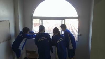 アイデアを出し合って、窓ふきをしています。中から外側を拭くのは、大変ですよね。