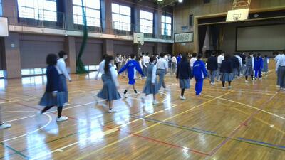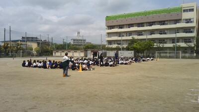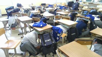 5月1日に避難訓練と近隣の小中学校合同で引き渡し訓練が行われました。天候の関係で、グラウンドへの避難ではなく、校舎内での避難行動となりました。地震発生の放送で、生徒たちは、素早く机の下にもぐっていましたが、体の大きい生徒は少しきつそうでした。「机の脚をしっかり持って」と先生から声を掛けられ、指示に従ってしっかり行動できていました。その後、津波に備え、1,2階にいる生徒と先生は4階の体育館に避難する訓練も行われました。