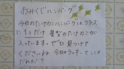 お話給食での筍ハンバーグ!おみくじ付きで楽しさアップ!