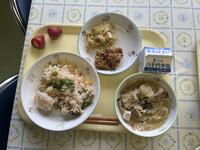 今日は、お花寿司、鶏のオニオン風味揚げ、ゆばのすまし汁、キャベツのおかかあえ、いちご、牛乳でした。