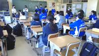 5月1日に避難訓練と近隣の小中学校合同で引き渡し訓練が行われました。天候の関係で、グラウンドへの避難ではなく、校舎内での避難行動となりました。地震発生の放送で、生徒たちは、素早く机の下にもぐっていましたが、体の大きい生徒は少しきつそうでした。「机の脚をしっかり持って」と先生から声を掛けられ、指示に従ってしっかり行動できていました。その後、津波に備え、1,2階にいる生徒と先生は4階の体育館に避難する訓練も行われました。