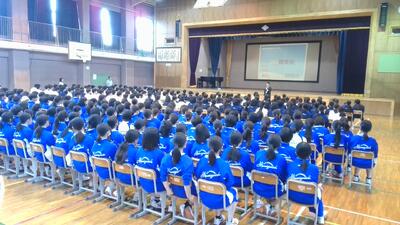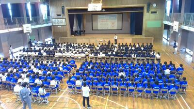 暑さのこともあり、体育館に全校生徒を集めず、各教室へのオンライン配信と合わせて行いました。