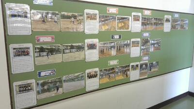 3年生の教室前の廊下には、総体に向けた意気込みと活動の様子がわかる写真が掲示されています。3年間の「思い」など、とても良いことが書かれていて、見ていると気持ちが高まり、どの部活も応援したくなります。
