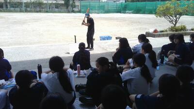 1年生女子の体育です。ティーボールのバッティングについて説明しています。暑いので、説明の時は、日陰で行っています。