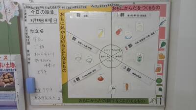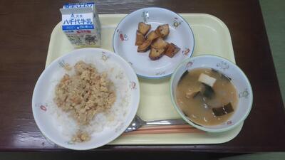 今日の給食は、ごんじゅう、牛乳、かつおの更紗揚げ、カラフルソテー、かきたま汁でした。ごんじゅうは、豚肉と油揚げを甘辛く煮て、ご飯に混ぜたもので、館山市地域の郷土料理だそうです。かつおとの相性もとても良く、おいしくいただきました。