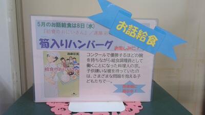 今日の給食は、「お話給食」筍入りハンバーグでした。この『給食のおにいさん』は図書館に展示中です。