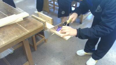 技術では、木材を加工して本棚を作っています。必要な部材をのこぎりで切断したり、やすりで削ったりしていました。素敵な作品を作ってくださいね。