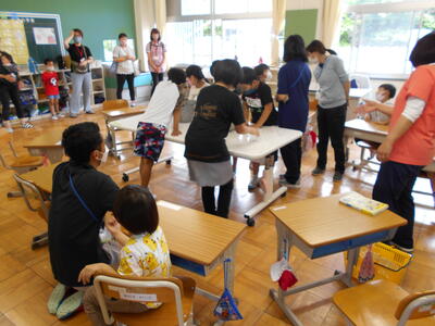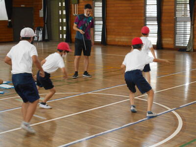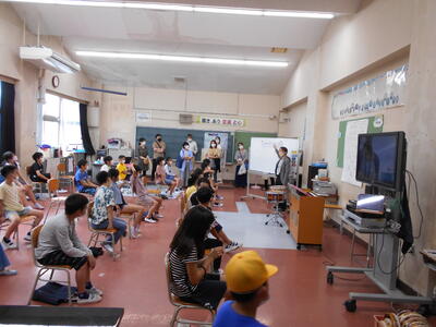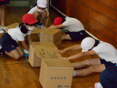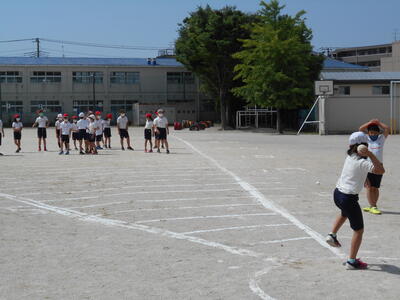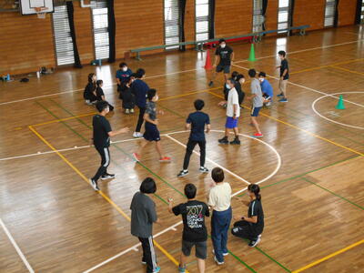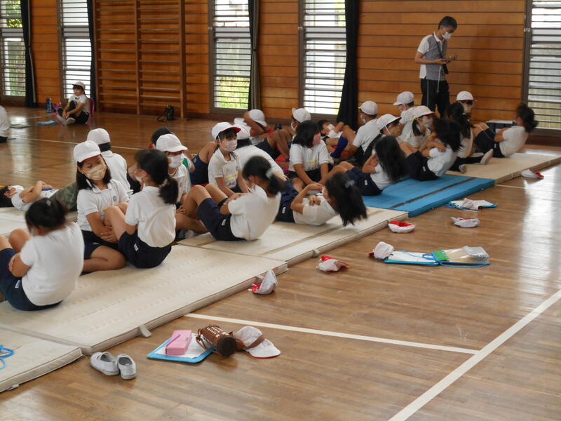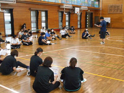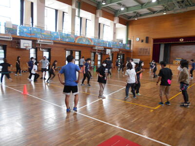 8月30日、先生たちは夏休み明けからの指導に向けて、校内で研修会を実施しました。午前中は、ICTの活用方法や教育的な配慮方法等、午後は大学の先生をお招きして、体育の実技研修を行いました。写真はその時の様子です。