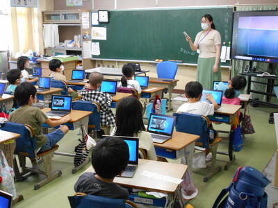 2年生は、ICT支援員の先生からタブレットの使い方を学びました。子どもたちは楽しそうにタブレットを操作していました。また、先生からはタブレットの取り扱いや写真の撮り方のルールなど、マナーについても教わりました。