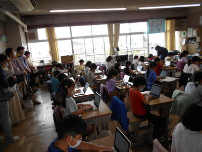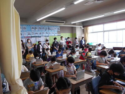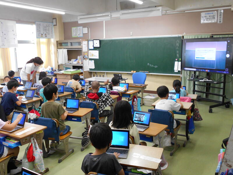 夏休みが終わり、いよいよ学校がスタートしました。登校時は、あいにくの雨に見舞われましたが、子どもたちは元気に登校してきました。夏休み明けの朝会は、Teamsを使ってオンラインで行いました。各教室では、表彰や先生たちの話を落ち着いた態度で見聞きしていました。