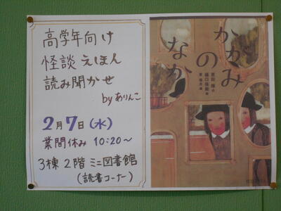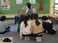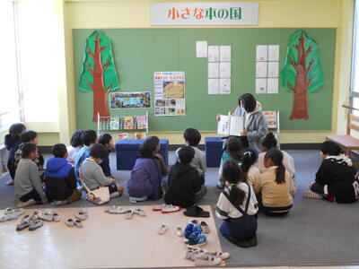2月7日の業間休みに、読み聞かせ会のありんこさんが絵本を読んでくれました。今日の開催場所は、先日名前が決まった3棟2階に設置したミニ図書館、「小さな本の国」です。カーペットの敷かれたコーナーに上履きを脱いで上がり、お話を楽しんで聞いていました。