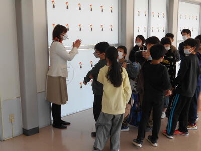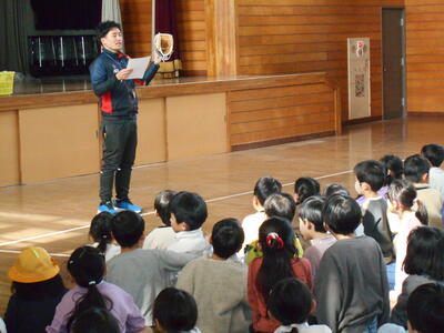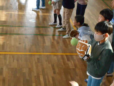 1月29日の午後に妙典少年野球場にて、大谷翔平選手からの寄贈グローブ贈呈式が行われました。本校からは、6年生の代表者が参加し、グローブやボールをいただいてきました。2月8日には、業間休みに1,2年を対象として、寄贈グローブを使ったイベントを体育館にて行いました。1,2年生は楽しくボール投げをしたりグローブにふれたりしていました。今後は、3年生以上の学年にもイベントを実施していく予定です。