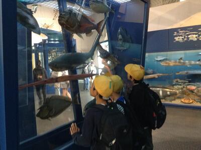 4年生が校外学習の日です。午前中は、茨城県自然博物館をグループで見学します。大きな恐竜のレプリカや、生きている魚、古代の様子を再現した森など魅了的な展示物がたくさんあります。