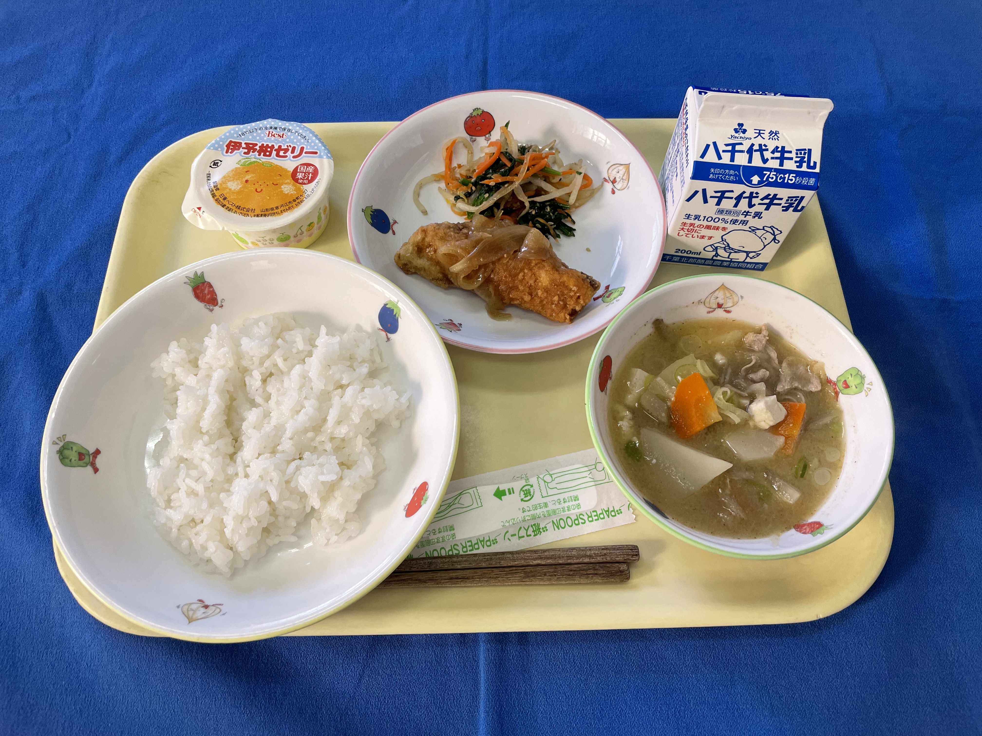 ご飯 魚の和風マリネ ごま和え 豚汁 いよかんゼリー 牛乳 |