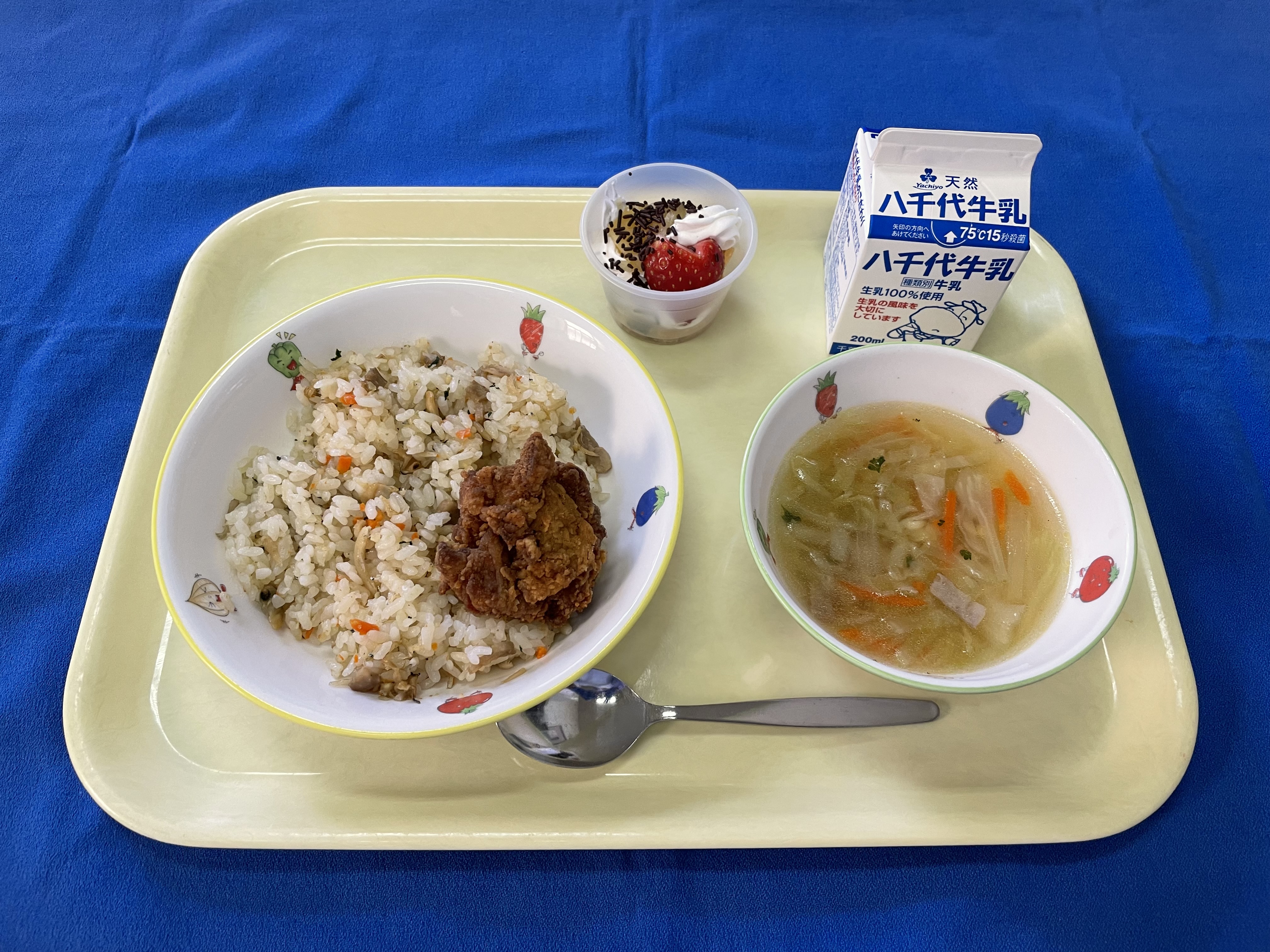 牛乳(千葉) 米(千葉) 鶏肉(岩手) パセリ(千葉/飯岡) 生姜(高知/吾川) にんにく(青森/十和田) 玉ねぎ(北海道/北見) 人参(千葉/山武) キャベツ(愛知) いちご(栃木) |