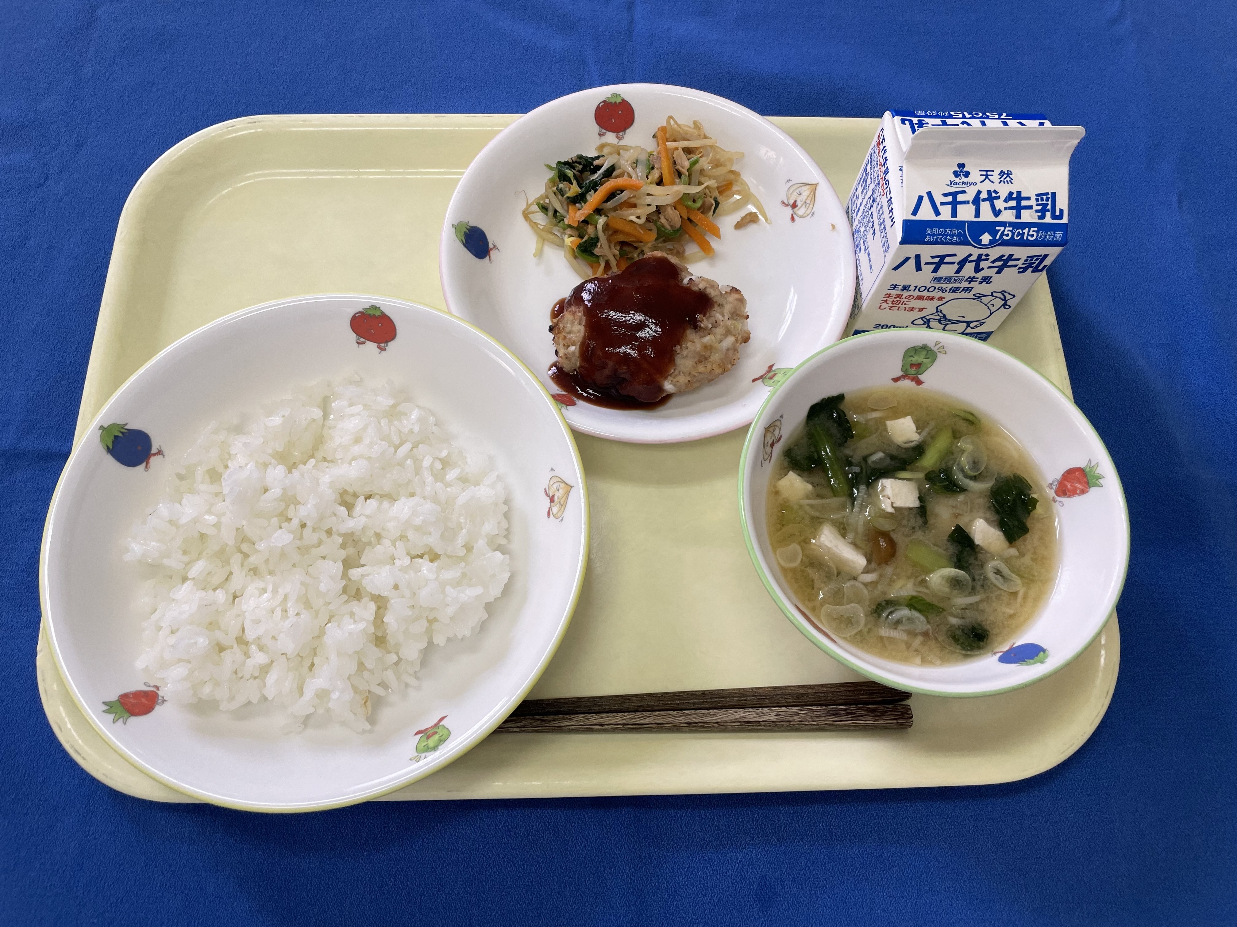 ご飯 まめまめバーグ もやしのカレー和え 味噌汁 牛乳 |