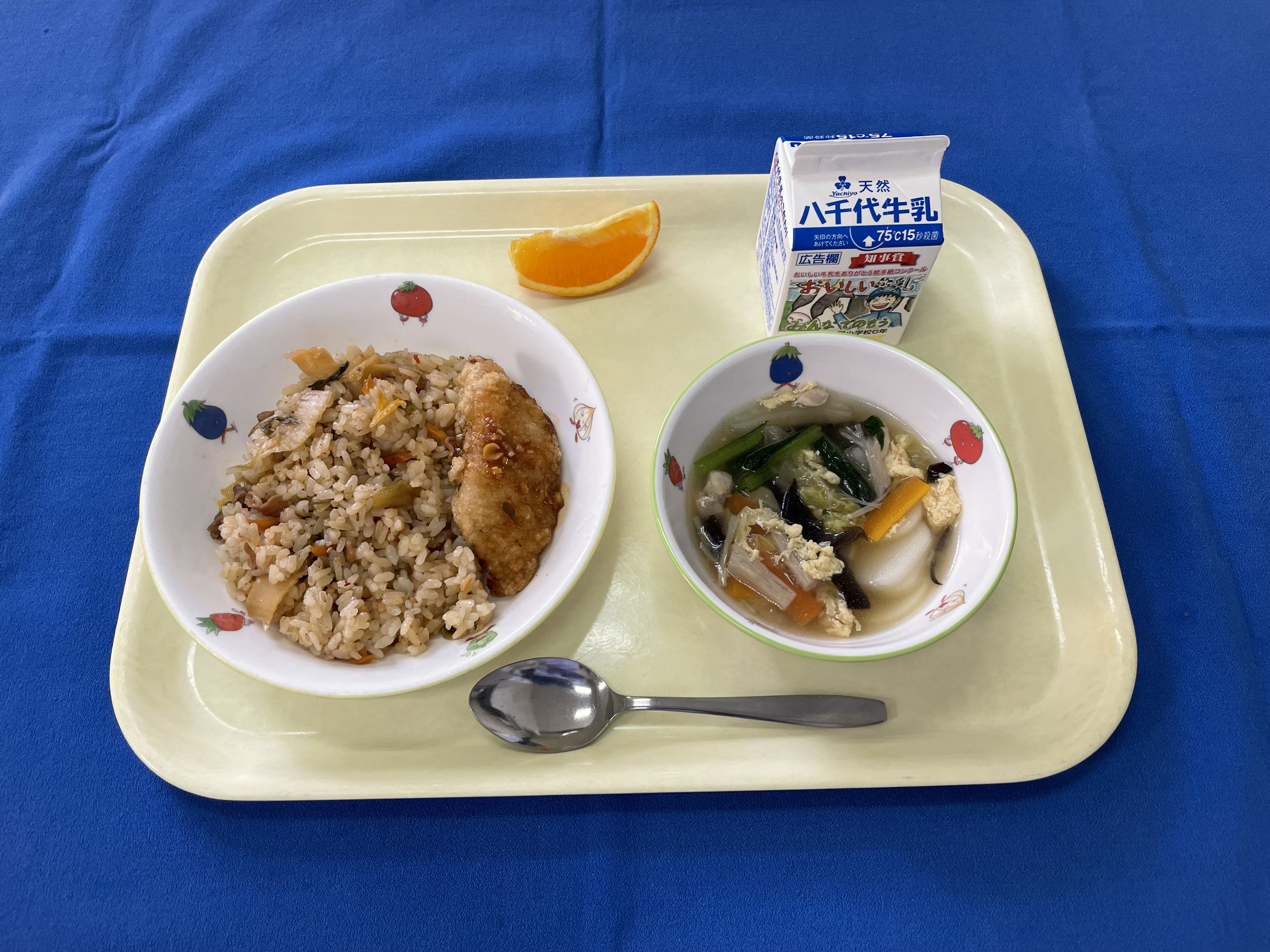 キムチごはん 白身魚の中華揚げ トック ネーブル 牛乳 ※納品の都合により、清見→ネーブルに変更となりました |