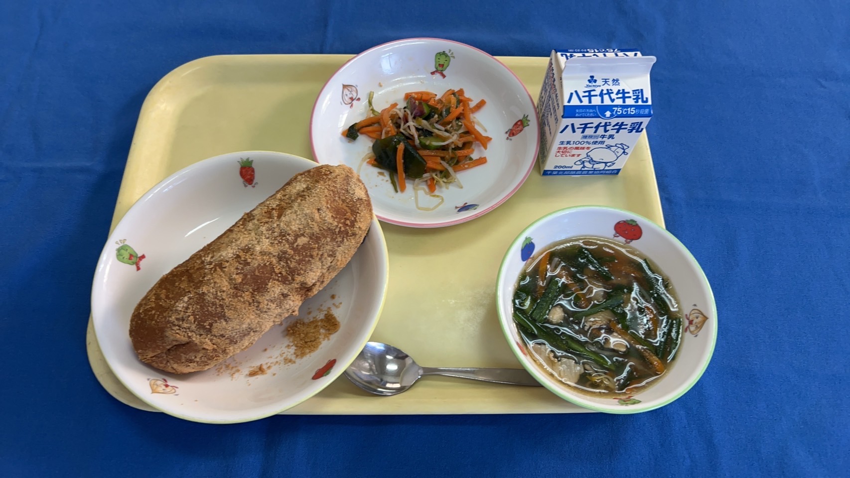 きなこ揚げパン ネギだれサラダ 春雨スープ 牛乳 |