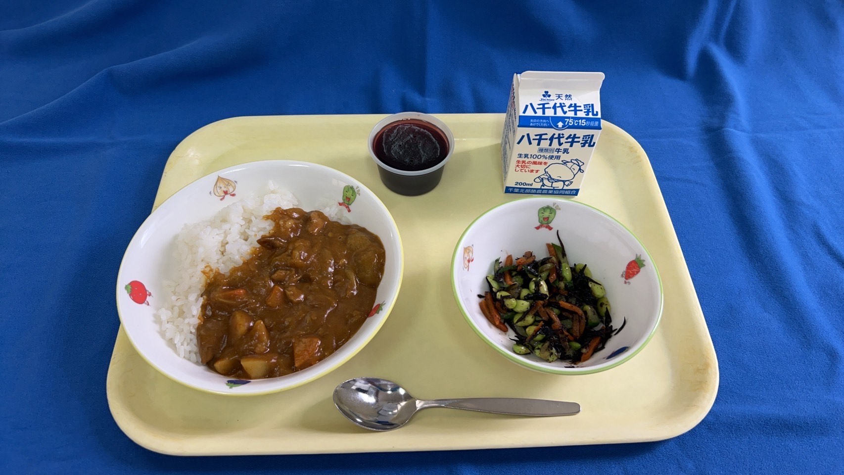 【1年生保護者試食会】 麦ごはん ポークカレー ひじきのマリネ ぶどうゼリー 牛乳 |