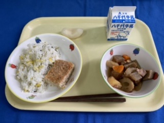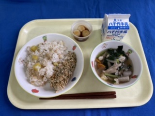 【十五夜献立】 牛乳 さつまいもご飯 鮭の香草パン粉焼き けんちん汁 月見団子 十五夜は9月10日(土)ですが、今日は一足早い十五夜献立です。 当日は月がきれいにみられるといいですね。 |