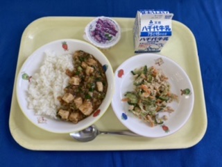 牛乳 ごはん マーボー豆腐 棒棒鶏 ぶどうゼリー |