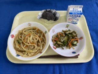 【お彼岸献立】 牛乳 カレーうどん 茎わかめのサラダ 手作りおはぎ |