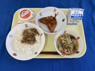 牛乳 ごはん ふりかけ アジフライ せんべい汁 アセロラゼリー |