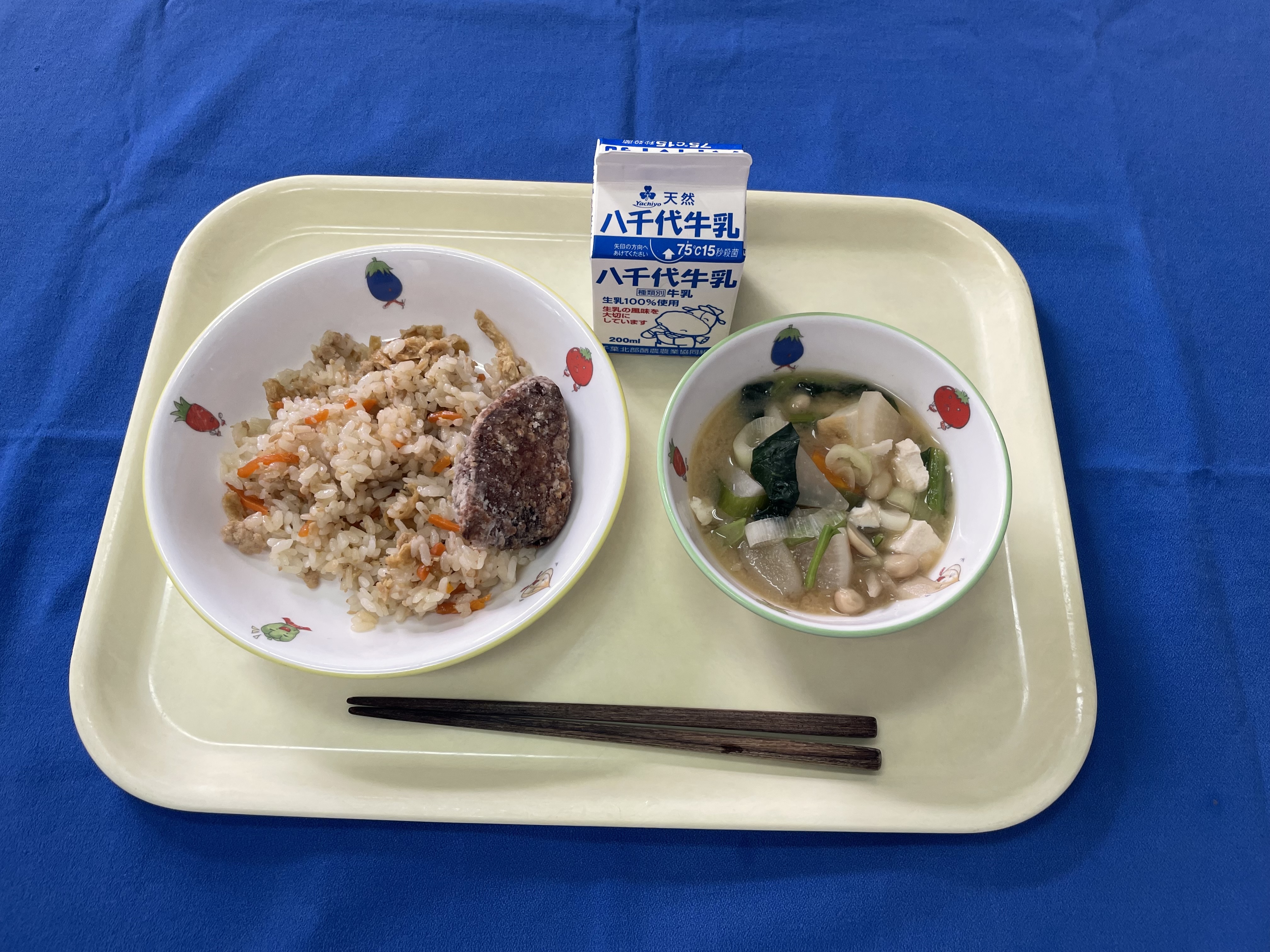 牛乳(千葉) 米(千葉) ごぼう(青森/十和田) 人参(千葉/船橋) 玉ネギ(兵庫/淡路) みつ葉(千葉) 豚もも肉(千葉) 鶏もも肉(岩手) |