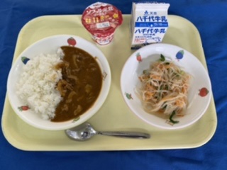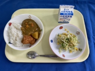 【運動会応援献立】 牛乳 ごはん カレー (カツカレー) チキンカツ コールスローサラダ |