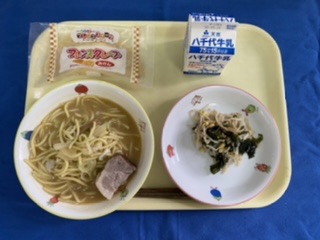 牛乳 みそラーメン 手作りチャーシュー 切り干し大根のナムル クレープ(みかん) |