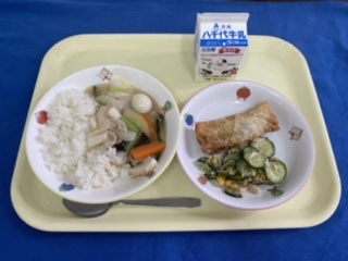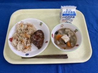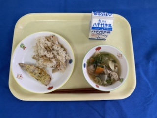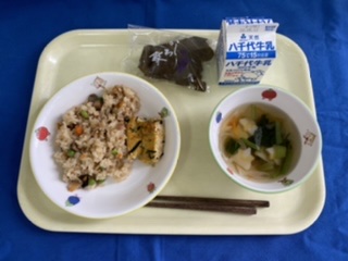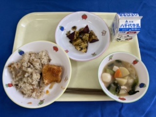 牛乳 鶏ごぼうご飯 いかの香味揚げ 八宝味噌汁 大学芋 ※「いかの香味焼き」→「いかの香味揚げ」に変更になりました。 |