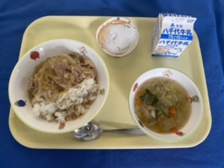 牛乳 ごはん 豚丼(具) ABCスープ かぼちゃのチーズケーキ |