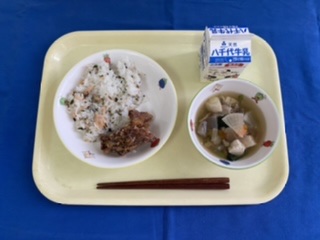 牛乳 鮭わかめごはん 鶏のから揚げ けんちん汁 |