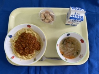 牛乳 ミートソーススパゲッティー 野菜スープ おふのラスク |