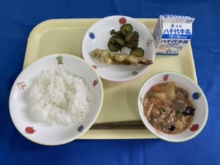 牛乳 ごはん ししゃもの天ぷら きゅうりの土佐和え 新じゃがのそぼろ煮 |