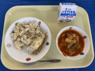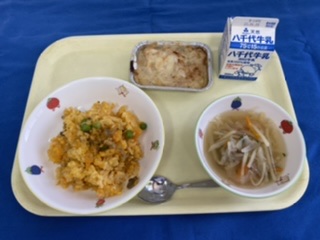 牛乳 にんじんピラフ 豆腐のツナグラタン ベーコンポテトスープ |