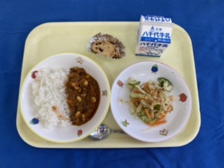 今日から一年生の給食が始まりました。 牛乳 カレーライス ひじきのマリネ お祝いゼリー |