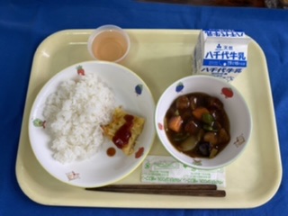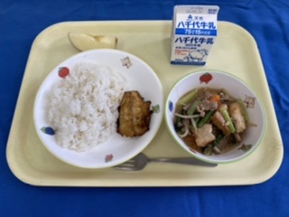 牛乳 ごはん サバカレー焼き 生揚げと野菜のうま煮 りんご |