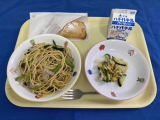 牛乳 豚肉と小松菜のスパゲッティー コーンとささみのサラダ ガルバンゾのパイ |