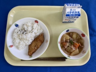 牛乳 子ぎつねご飯 かつおの竜田揚げ 田舎汁 |