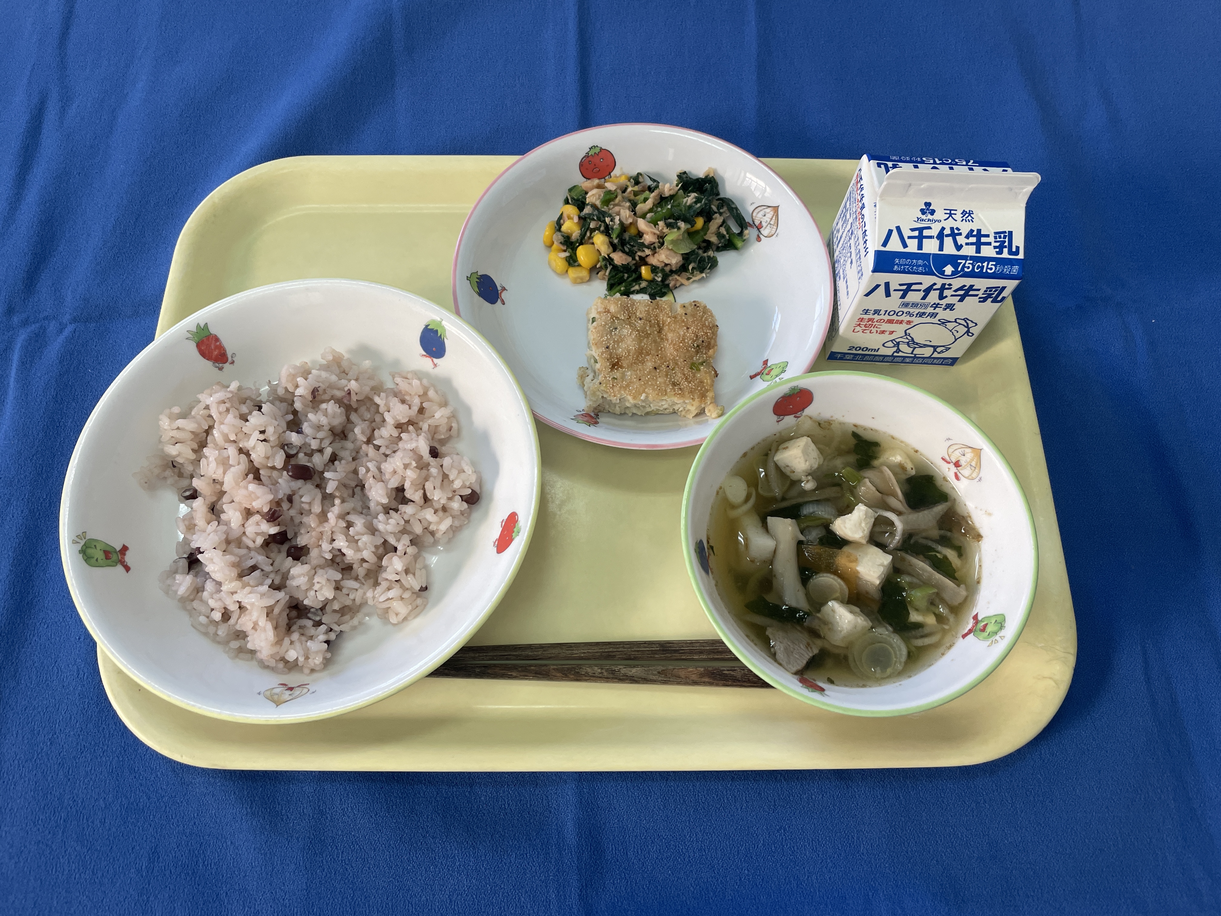 【小正月献立】 小豆ご飯 松風焼き 小松菜のツナ和え けんちん汁 牛乳 |
